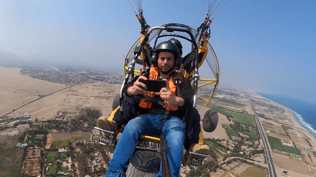 Pasajero disfrutando de un emocionante vuelo en paratrike sobre la costa de Lima.